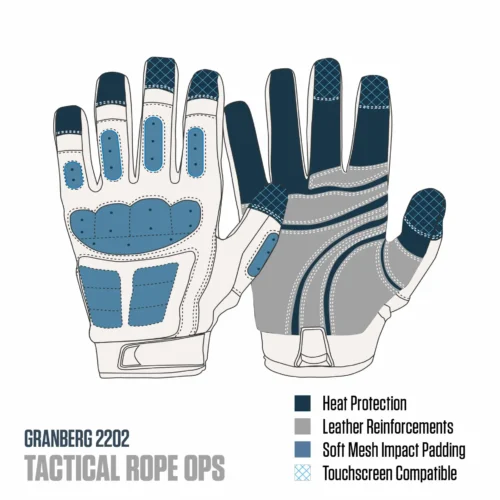 GRANBERG 2202 Tactical Rope Ops är avancerade skyddshandskar som är utvecklade för högrisksituationer där kontroll, slitstyrka och värmetålighet är avgörande. Framför allt är handskarna anpassade för rappellering, K9-insatser och taktiska operationer där arbete med rep, friktion och snabba rörelser ställer mycket höga krav på utrustningen.